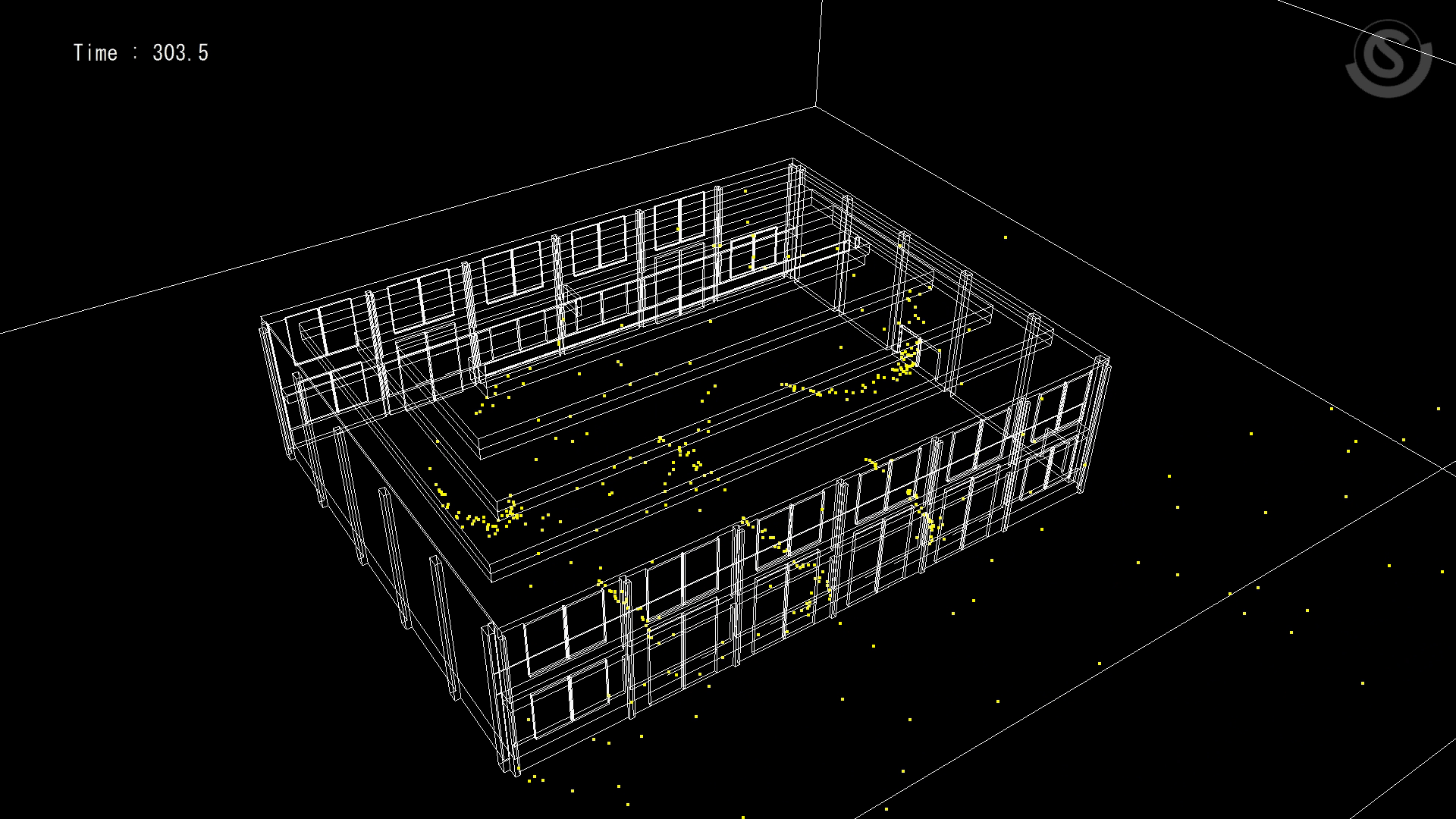 比較的遅い流れの中で、エアコンに吸い込まれる粒子も見られる。ステージ側へ移流拡散していくものも多い。一方で旋回流に乗った粒子は、かなり長時間に渡って空間中を漂っている様子もうかがえる。